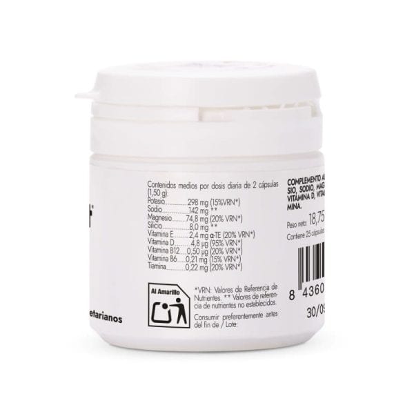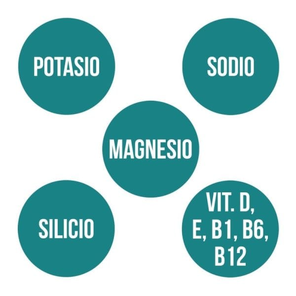 Contiene por porción: 298 mg de potasio, 142 mg de sodio, 74,8 mg de magnesio, 8 mg de silico, 2,4 mg de vitamina E, 4,8 mcg de vitamina D, 0,50 mcg de vitamina B12, 0,28 mg de vitamina B6 y 0,22 mg de tiamina. SALES MINERALES